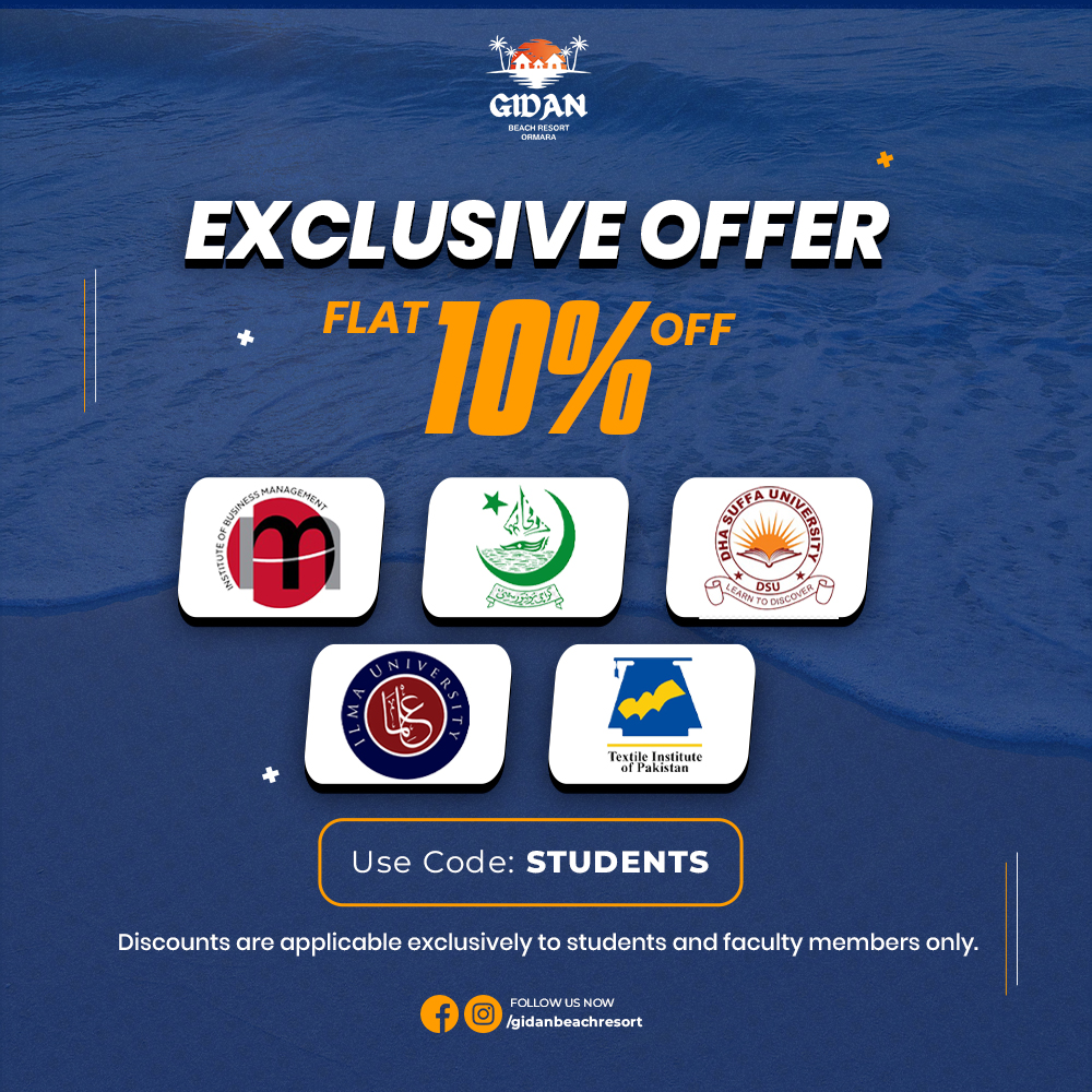 Gidan Beach Resort offers an unmatched coastal luxury experience. The resort features clear water, sand, tranquility, and a luxurious environment. All this is available right in the heart of Ormara, Balochistan.